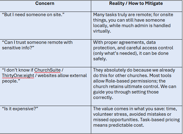 Not a replacement for pastoral or ministry leadership; rather an extension of your admin capacity—especially helpful when internal volunteers or staff are already maxed out.